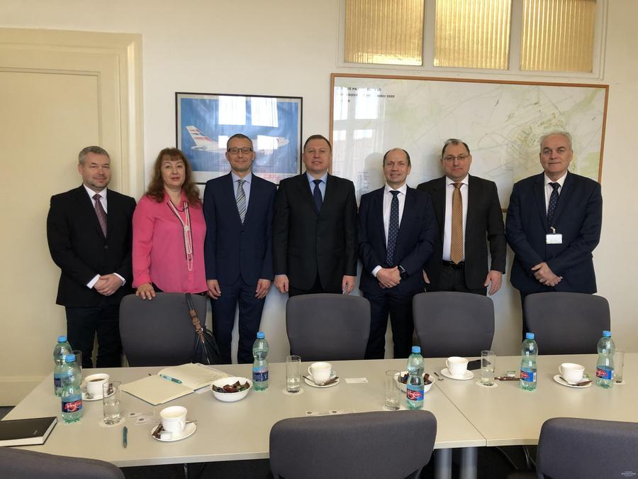В рамках візиту до м. Прага в.о. ректора НАУ Володимир Шульга, проректор з міжнародного співробітництва і освіти Ірина Зарубінська та помічник ректора Сергій Кондратюк відвідали Міністерство транспорту Чехії і провели робочу зустріч із заступником голови департаменту цивільної авіації цього міністерства Мареком Шкрною та заступником директора Управління цивільної авіації Чехії Витеславом Хезкі. Також у заході взяли участь Міхал Маркович та Іржі Прохазка, керівники льотної школи FAIR, де навчаються студенти-пілоти НАУ.